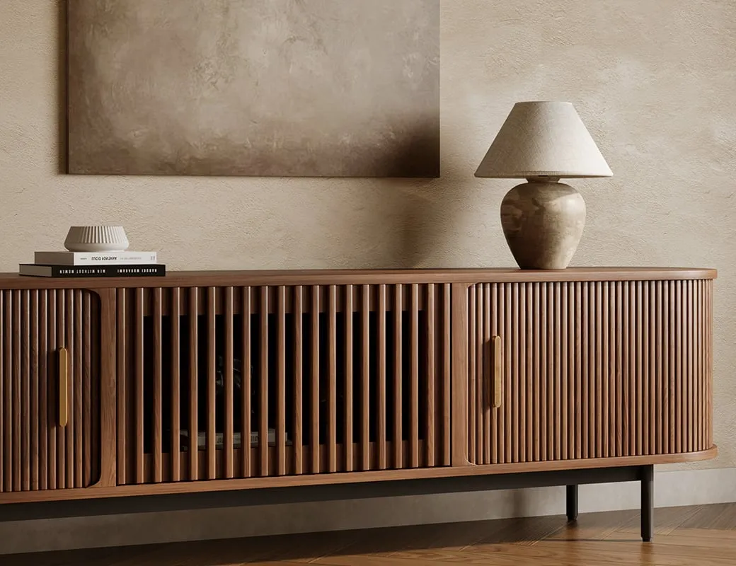 • The Aesthetic: We are obsessed with their walnut veneer and slat detailing. It hides all your tech clutter while adding warmth and texture to the room, balancing out the “black hole” effect of a large TV.